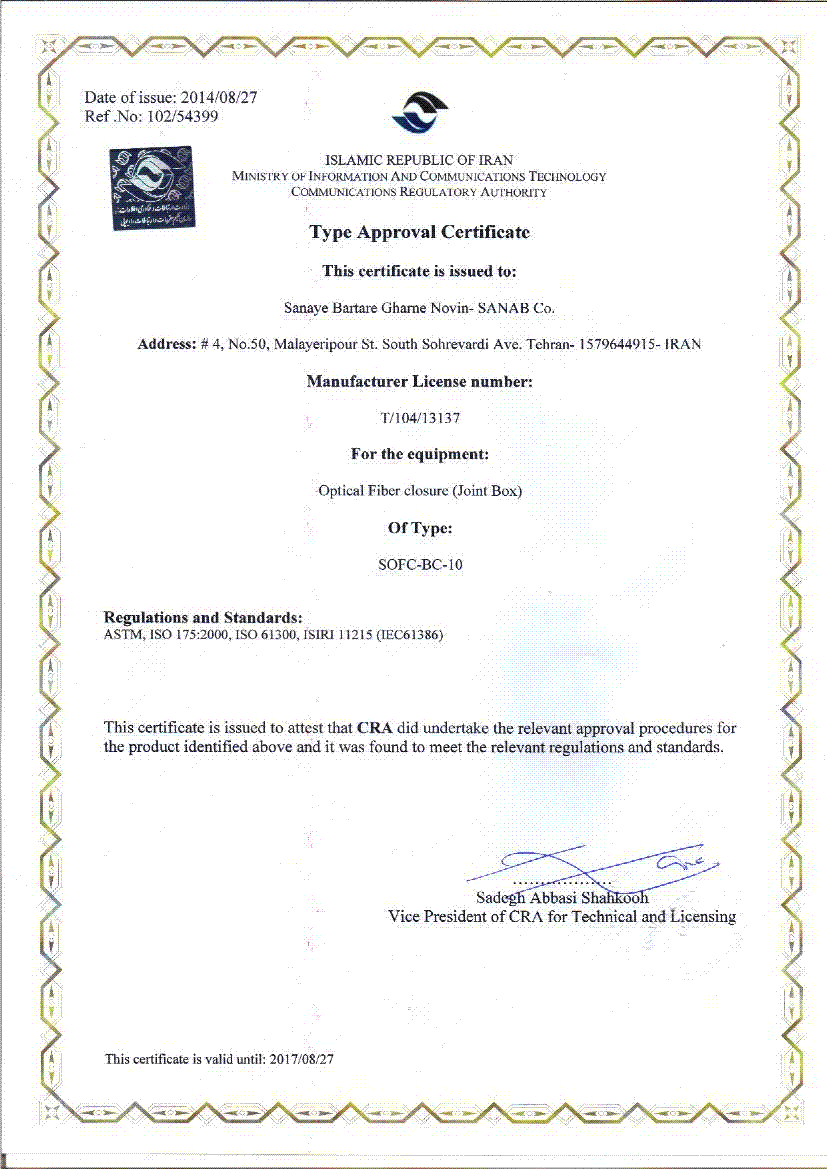 On 27 Aug. 2014, after carefully review the Regulatory Authority of Islamic republic of Iran(affiliated to the Ministry ICT) the Type Approval Certificate for SOFC-BC-10 SANAB under the standard: ASTM, ISO 175:2000,ISO 61300, ISIRI 11215(IEC61386)